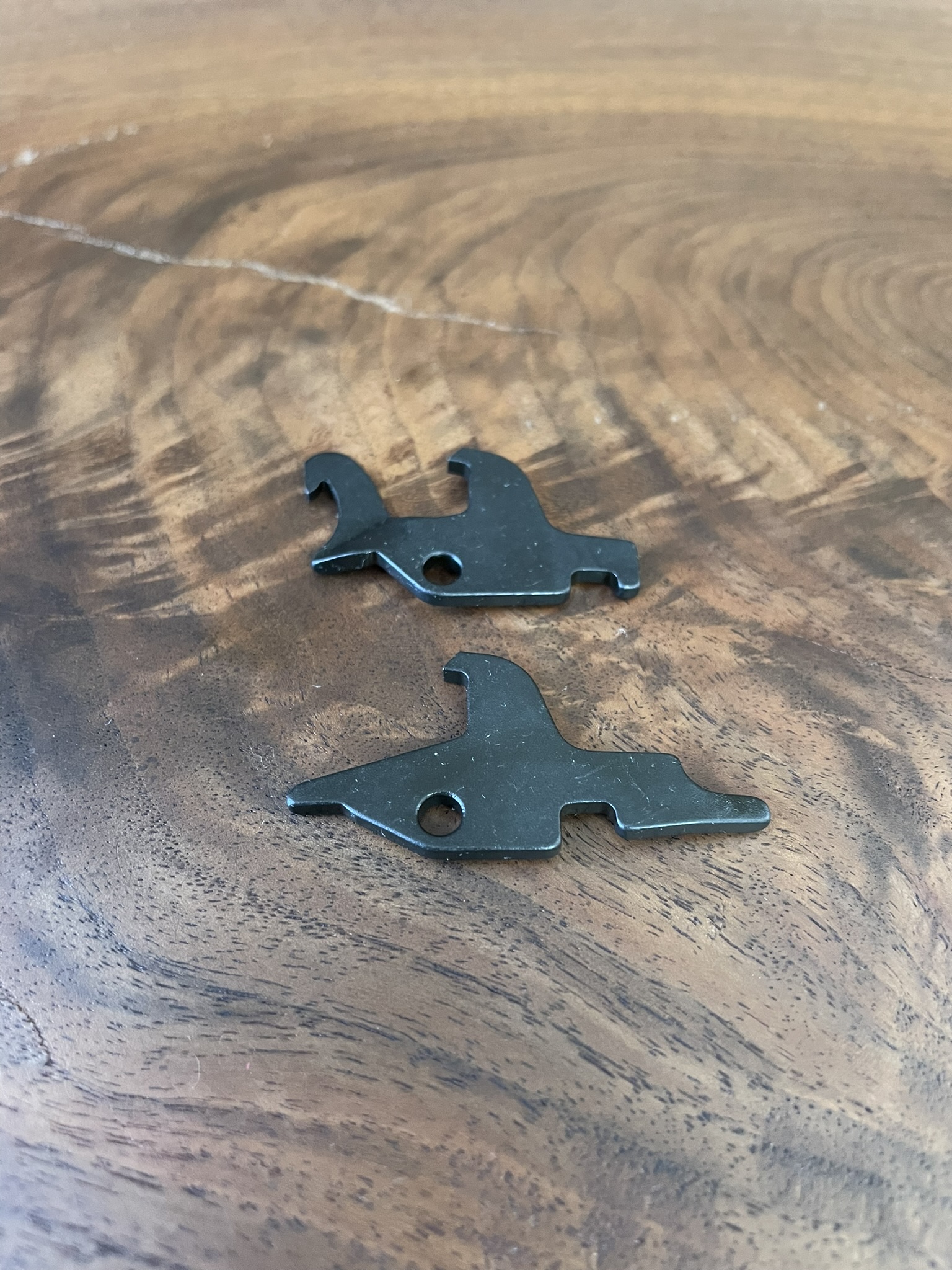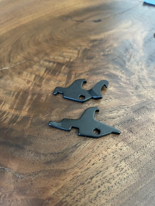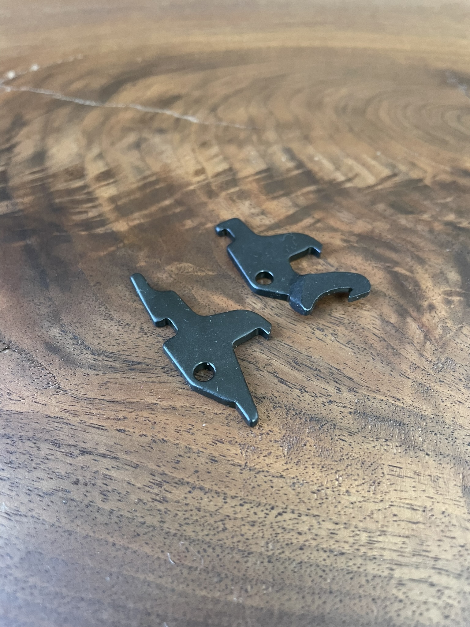 This Disconnector set for your AR-15 or M16 variant is a two piece disconnector set (1 single hook, 1 double hook) designed to work with registered full auto lower receivers. Set is used for the 3 round burst system in later M16 and M4 variants.
