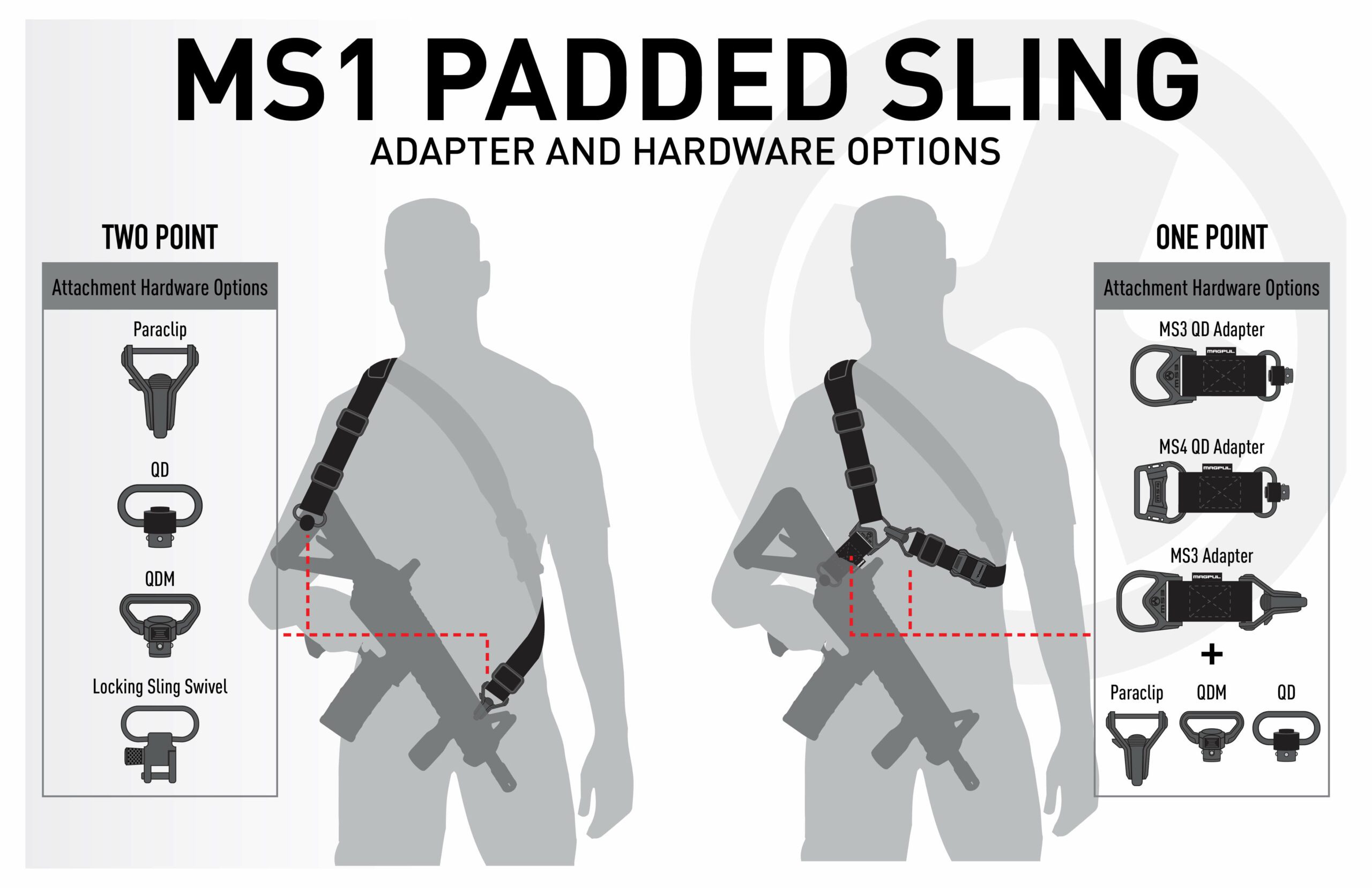 Built around our MS1 slider, this system provides rapid adjustments to either lengthen or shorten the sling with no slipping once set, and no tails, loops, or other potential snag hazards. In a two-point role, the MS1 allows easy shoulder transitions, rapid adjustability for hands free rifle carry and shooting support from various positions. The MS1 system also has a series of adapters that are sold separately and based on the MS3 and MS4 slings. By adding the appropriate adapter (available with Paraclip or QD Sling Swivel) for the sling, you can easily add one-point functionality to your MS1.
