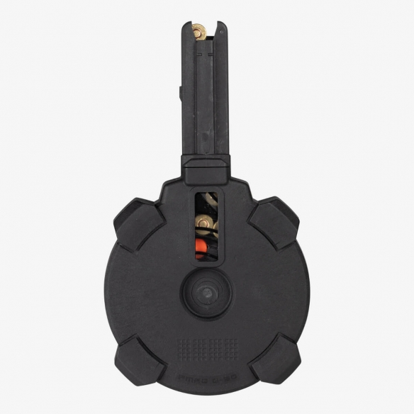 - Unique drum configuration gives it roughly the same overall height profile as a standard 25-round PMAG, making storage and shooting from various positions—including prone–nearly identical