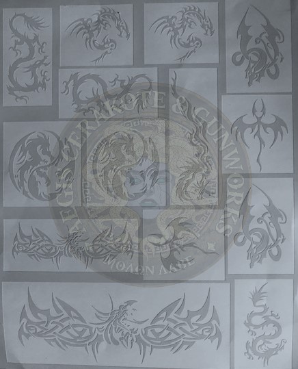 • 1 – 8.75″ x 11″ stencil sheet with 14 stencils ranging from approximately 1.5″ x 2.5″ to 2″ x 2″ each and 6″ x 2.3″ for the large dragon