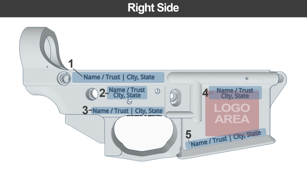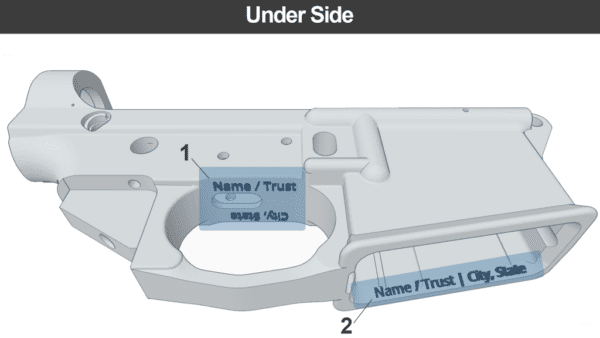 Your Name/Trust name city and state can be engraved anywhere it is visible and can be as small as 1/16″ in height. The minimum depth required by the ATF is .003″ but we always engrave deeper to handle Cerakote coatings that might be applied in the future.
