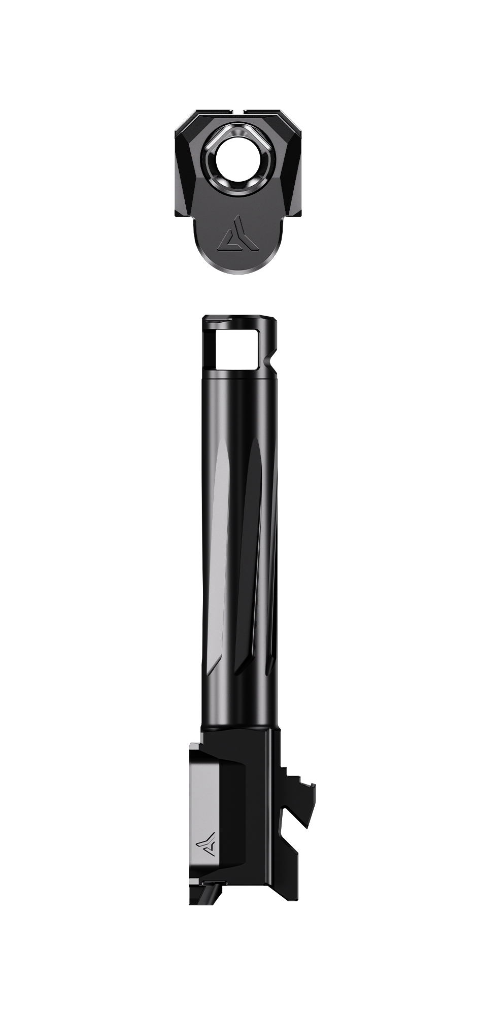 The INTRA-LOK mounting system uses the taper lock principle; a tapered locking screw interfaces with an angled V-groove on the underside of the barrel. This perfectly times the compensator as it locks down onto the upper barrel profile on the muzzle end of the barrel.