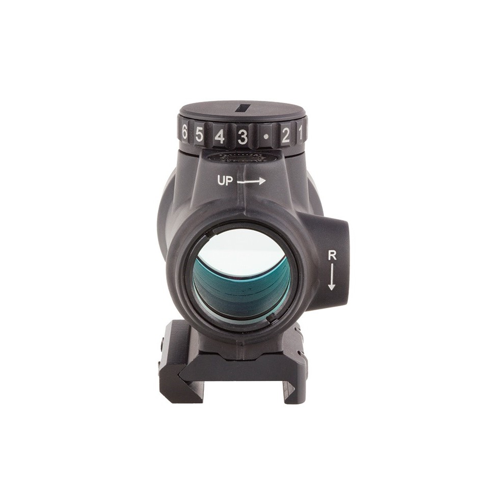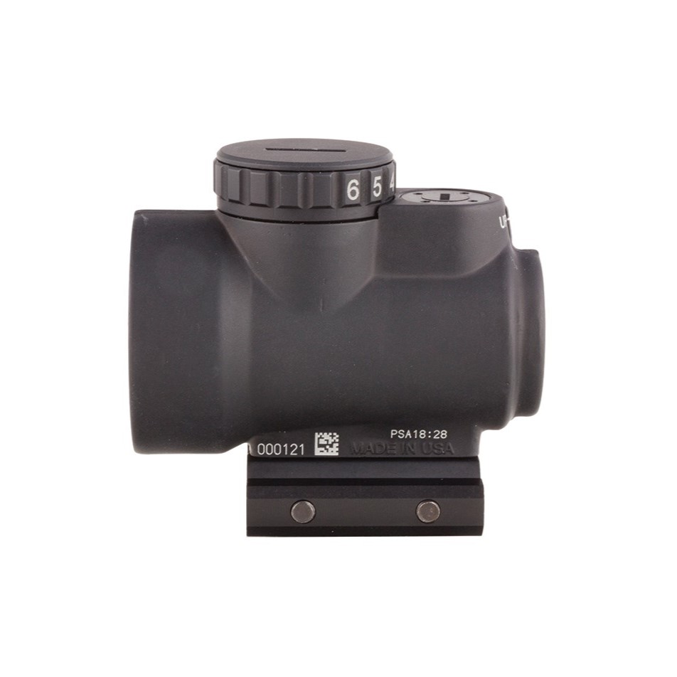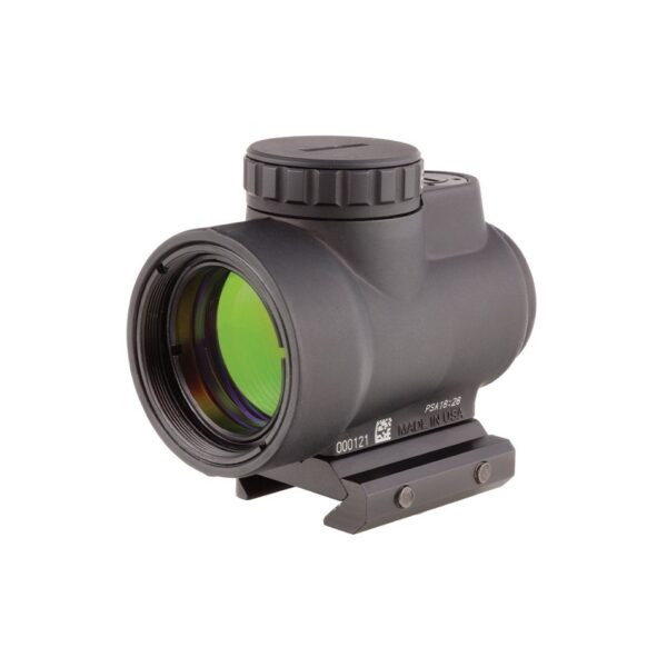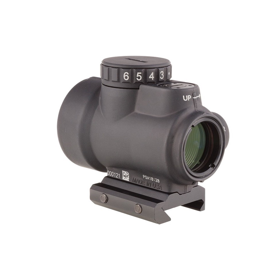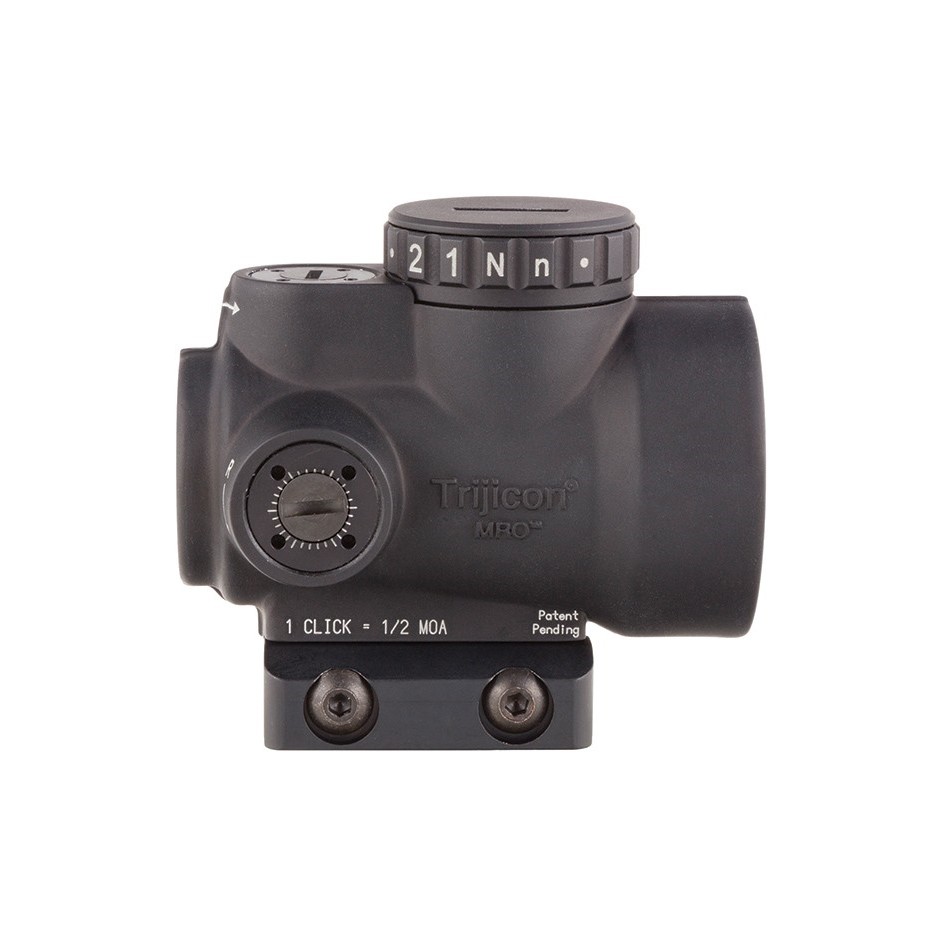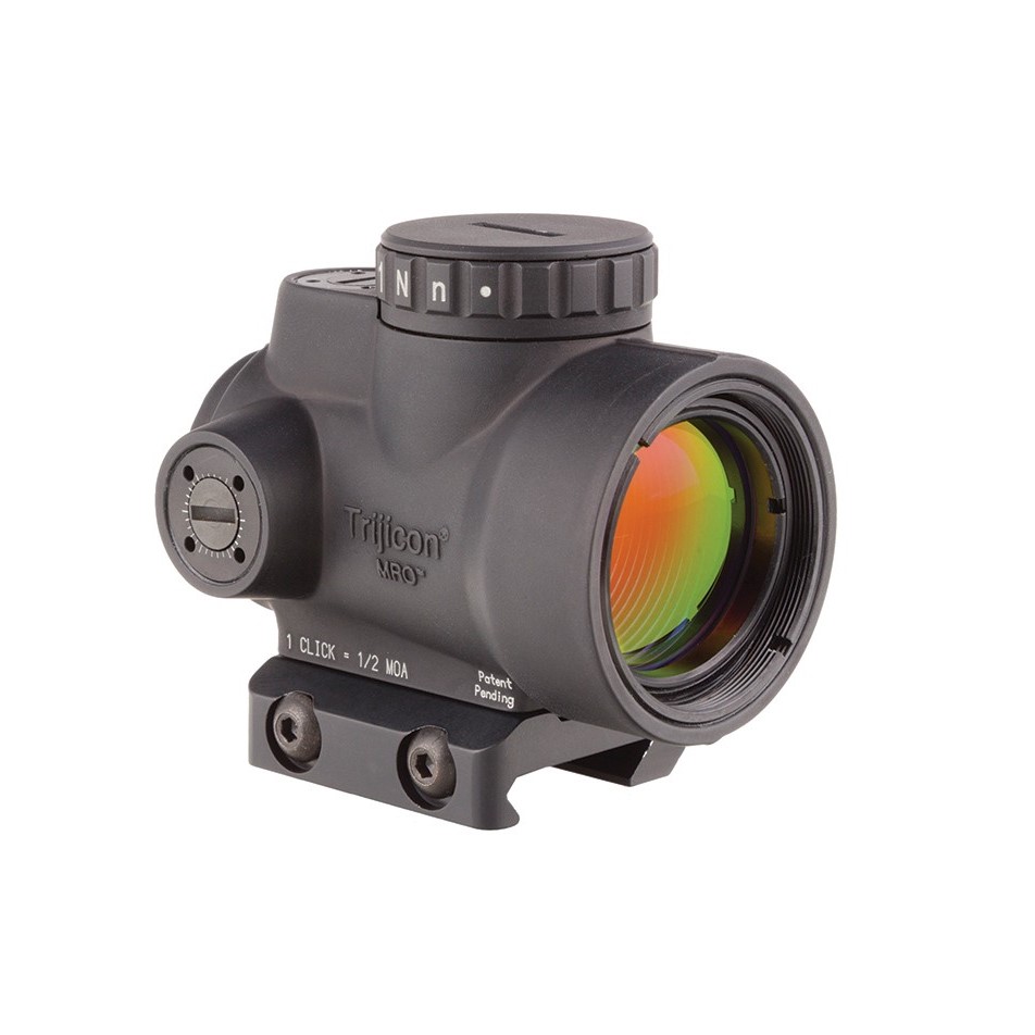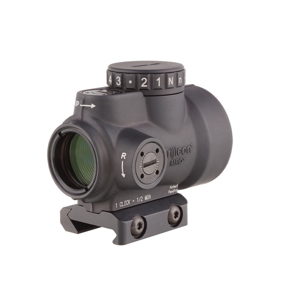 The Trijicon Miniature Rifle Optic (MRO) is a reflex-style, sealed sight intended for use on rifles, carbines, and shotguns to provide fast target acquisition. It is designed to be used with both eyes open, providing the operator with maximum situational awareness. The large aperture and tapered light path maximizes the viewing area in such a small optic, allowing for fast target engagement – especially from non-standard shooting positions. Advanced lens coatings and electronics produce a crisp red dot. The brightness control dial on the MRO is specifically designed for ambidextrous usage. With a mid-adjustment “off” position and eight discernible brightness settings, this brightness dial allows for quick and ergonomic adjustments. The MRO features fully protected adjusters that maintain zero even during rough handling, and can be adjusted without the need for special tools. Hard-anodized, forged 7075-T6 housing is fully sealed and waterproof, providing durability in demanding conditions.